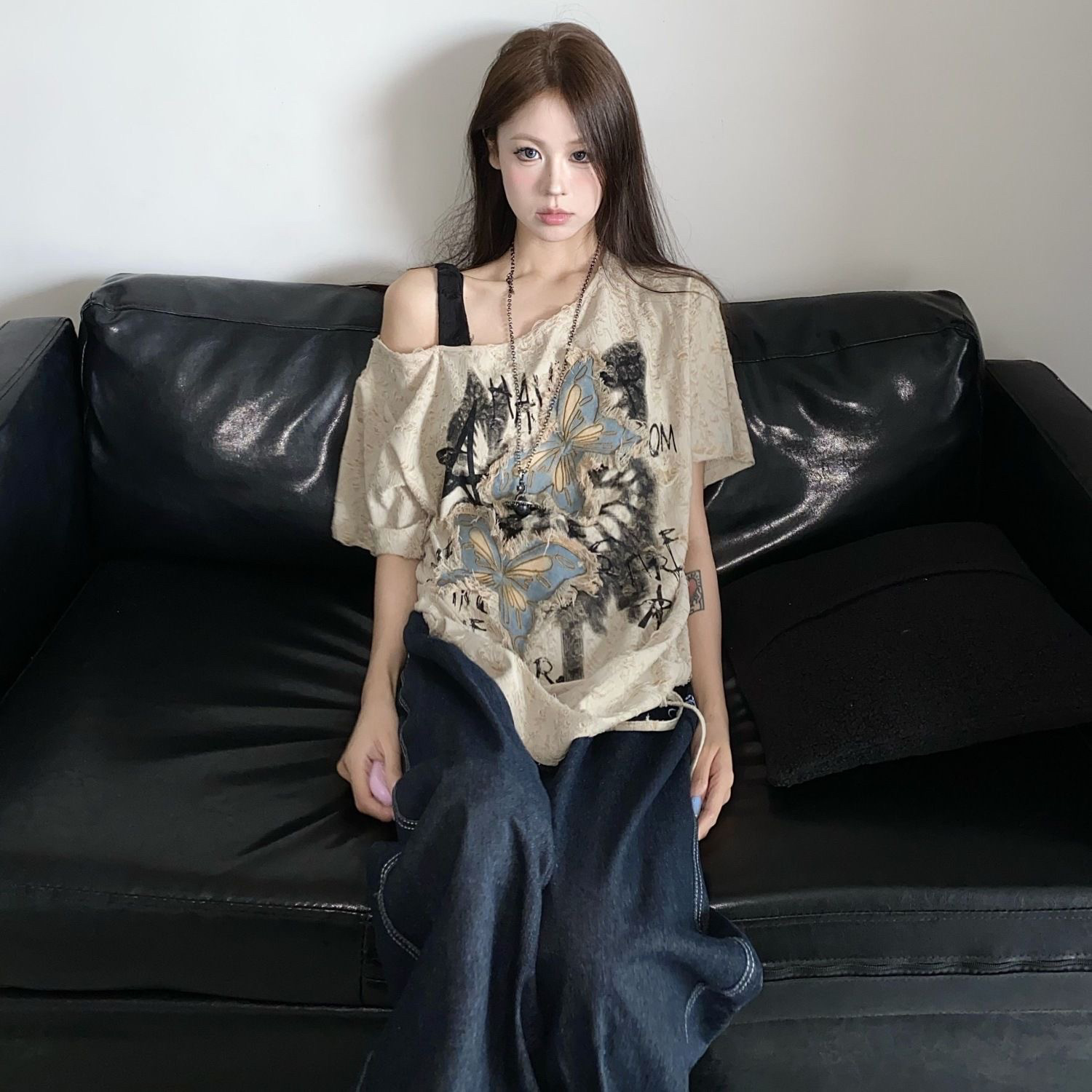 夏季必備斜肩蝴蝶短袖T,透氣不悶熱,暴汗不粘身,寬鬆版型遮肉顯瘦,通勤逛街穿它,舒適又吸睛!